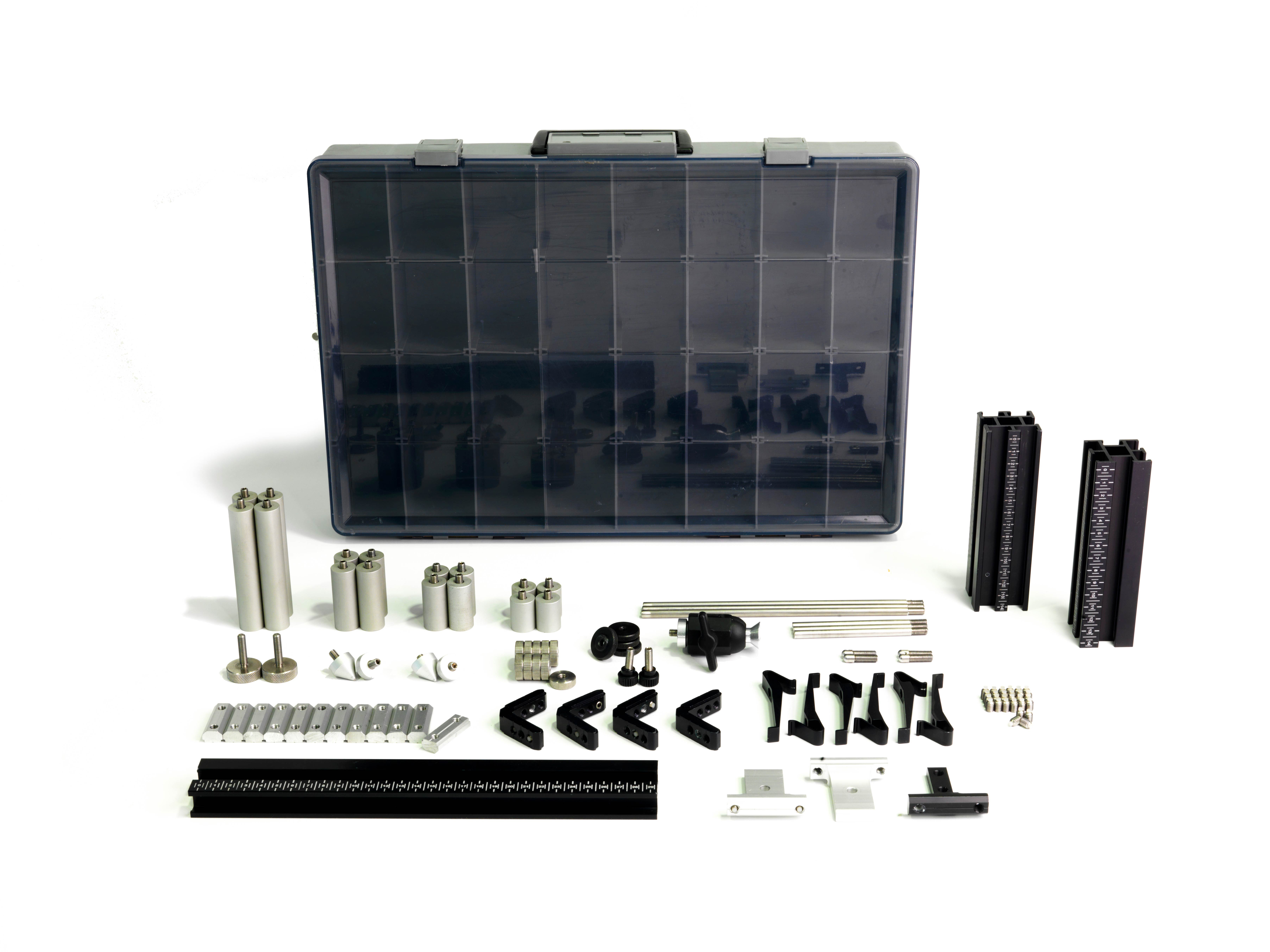 Any number of designs can be created from a single fixture kit. Over one hundred high quality parts manufactured from anodised aluminium and stainless steel are supplied in a compartmented storage case. All types of prismatic and free form parts can be held and supported correctly during measurement.